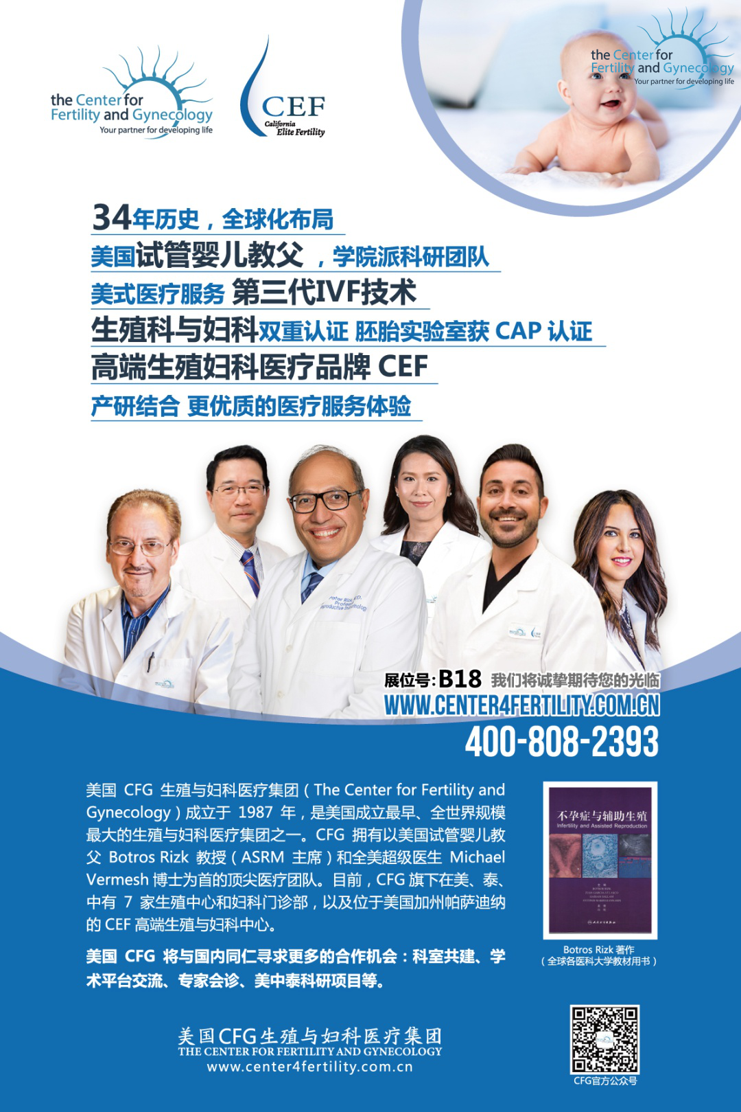 美国CFG生殖与妇科医疗集团也将出席本次全国生殖医学学术会议。美国CFG成立于1987年,是美国成立最早、全世界规模最大的生殖与妇科医疗集团之一,目前CFG旗下在美国、泰国、中国共设立7家生殖医疗中心、妇科门诊部、以及CEF(Califonia Elite Fertility)高端生殖与妇科医疗中心。